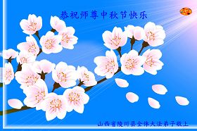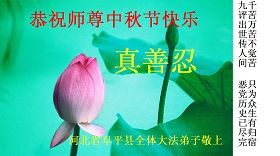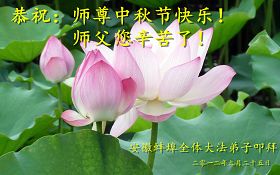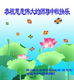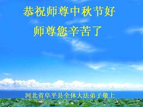 中秋将至,弟子想念师尊,远在千里之中国大陆,遥祝师尊节日快乐!弟子谨遵师尊教诲,努力做好三件事,以报师恩。 天津西青区、河西区、南开区部份大法弟子 山东大法弟子恭祝师尊中秋节快乐!