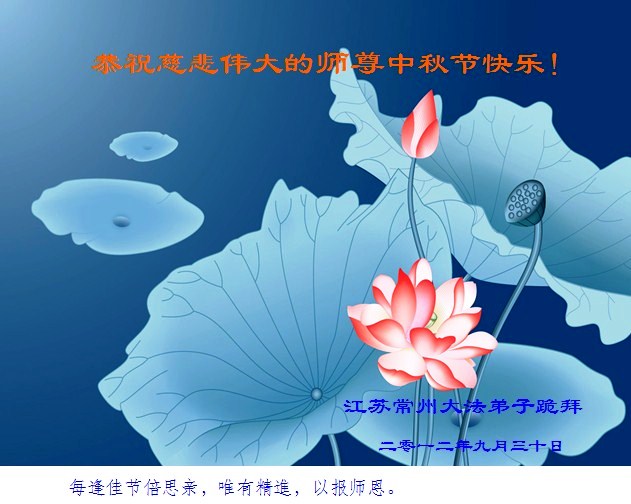 恭祝慈悲伟大的师尊中秋节快乐! 每逢佳节倍思亲,唯有精進,以报师恩。 江苏常州大法弟子跪拜 二零一二年九月三十日 吉林省长春全体大法弟子恭祝慈悲伟大的师尊壬辰年中秋快乐!