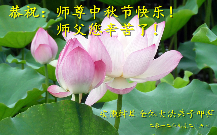 师父您好!师父您辛苦了?在中秋佳节之际,我们大陆大法弟子想念您,盼望早日见到慈悲伟大的师父,在此恭祝师父中秋节快乐!弟子一定做好三件事,请师尊放心。 河北省涿鹿县五人学法小组 二零一二年九月二十五日 大陆大法弟子恭祝慈悲伟大的师父中秋佳节快乐!