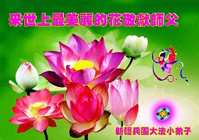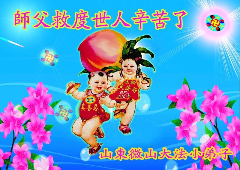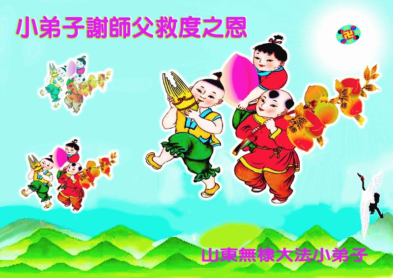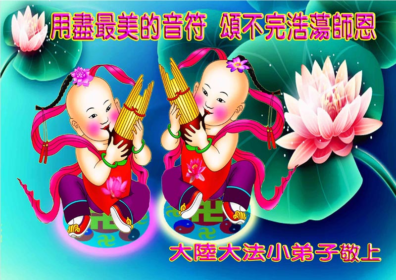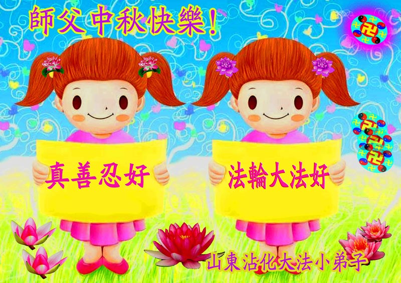 感谢师父的慈悲救度!弟子荣幸得大法,伟大的师父时刻都在呵护着弟子,我们天天念“法轮大法好,真善忍好”,弟弟妹妹们都会背好几首《洪吟》呢。我们五个大法小弟子真是无病一身轻,什么药我们都不在其中,又天真、活泼、可爱、聪明。我这次中考也考進本地一中,这都是师父与大法恩赐予小弟子的荣耀,谢谢师尊!弟子一定谨记师尊的教诲,用“法轮大法”宇宙标准“真、善、忍”严格要求自己,做个合格的大法弟子。 辽宁省丹东市东港市大法弟子清莲及两位小弟子借中秋来临之际恭祝伟大师尊中秋快乐!