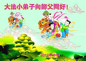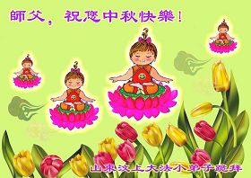 【明慧网二零一二年九月三十日】法轮大法弟子中有很多纯真的小弟子,他们也将发自内心的贺词、贺卡寄给明慧网,恭贺慈悲伟大的师尊中秋快乐。 大陆大法小弟子恭祝慈悲伟大的师尊中秋佳节快乐!