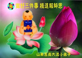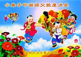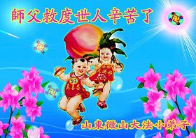 五岁小弟子趴在奶奶耳边悄悄说:我昨天做了一个梦,梦见师父爷爷派了好多神仙接我到天上,我在天上和神仙们一起飞。请奶奶帮她给师父写封信:天津南开区五岁大法小弟子恭祝师尊中秋快乐! 黑龙江省佳木斯大法小弟子恭祝师尊中秋节快乐!