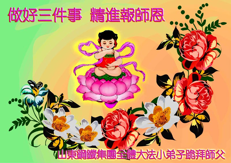 师父您好!弟子沐浴在师父的浩荡佛恩之中,幸福宁静,用真善忍法理归正自己的一思一念,走在神的路上。其实师父已经为弟子做好了一切,只等弟子在大法中不断的升华,不断的同化大法,按照师父所要求的标准往前走直至法正人间的到来,随师父回家。弟子一定不让师父失望,听师父的话,做好三件事,迎接那辉煌时刻的到来!跪拜师父!合十! 山东钢铁集团全体大法小弟子恭祝师尊中秋快乐!