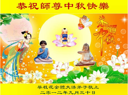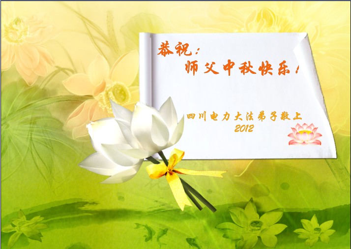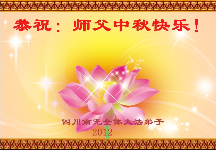 在中秋佳节之际,我地全体大法弟子向慈悲伟大的师尊问好,我们决心多学法、学好法,努力做好正法“三件事”,遇事向内找,中秋添正念,紧跟师父正法進程,完成各自的正法使命,圆满随师还。 二零一二年八月初一 四川绵阳大法弟子恭祝师尊中秋快乐!