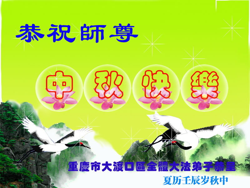 云南楚雄全体大法弟子向慈悲伟大的师尊问好!感谢师尊慈悲救度!向师尊合十! 重庆市九龙坡区全体大法弟子恭祝师父中秋节快乐!