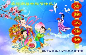 中秋快到了,中秋佳节倍思亲。师父大陆大法弟子想念您!四川达州市一大法弟子代全家所有修炼弟子及常人家属向师父问好。祝师父节日快乐!我们一定修好自己,多救众生、完成使命。 四川省泸州市叙永县祖孙俩大法弟子恭祝慈悲伟大的师尊中秋佳节快乐!唯愿恩师多一分欣慰,少一份操劳!