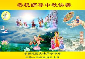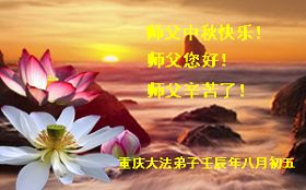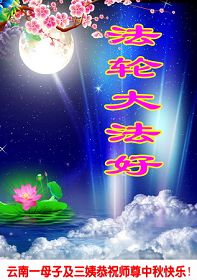 师尊您好!在最后的正法路上,弟子一定会谨记师尊慈悲的教诲,抓紧时间修好自己、做好三件事,多找回昔日同修,放下自我,圆容整体,愿师尊欣慰!弟子叩拜! 云南大法弟子祝师尊中秋节快乐!