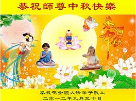 尊敬的师父您好! 我是一个身患眩晕症、心脏病、肩周炎、风湿病、肠粘连等多种疾病、千疮百孔的妇女,常年痛苦难耐,药水当餐,病魔缠身,生不如死。一九九八年六月份幸得大法,百病不翼而飞。十四年来,我精神爽快,走路一身轻,这一切都是师父的慈悲救度,是大法改变了我的人生命运,我万分感谢师父,感谢这万古不遇的高德大法。 我不识字,但是我能通读《转法轮》,能背诵师父的很多经文,这都是师父的洪大慈悲、大法的超常,弟子感激之情无以言表,只有遵照师父的要求,做好三件事,讲清真相,救度更多的众生,跟师父回家。 八月十五要来了,我和我们全家人跪谢伟大师父的救命之恩,敬祝师父中秋佳节快乐! 四川开江一女大法弟子和全家人拜上! 2012年9月25日 重庆江北一学法小组祝师尊中秋快乐!