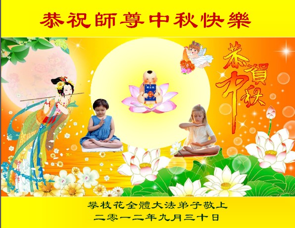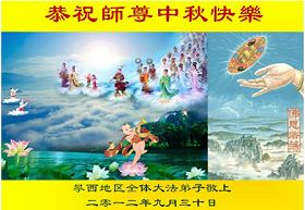 无法用语言来表达师尊的救度之恩!在这里只能略表心意恭祝我们慈悲伟大的师尊:中秋快乐!师尊请放心!弟子们一定走正走好以后的路!放下自我,整体配合,整体提高,做好三件事!跟师尊回家! 眉山市大法弟子敬上 二零一二年九月二十五日 重庆大法弟子祝尊敬慈悲的师父中秋快乐!