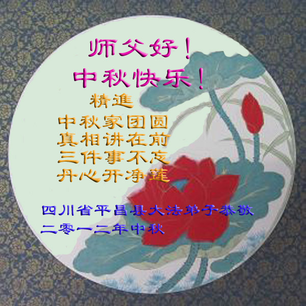 师父:您好!在此,弟子一家三口感谢师父的救度之恩,弟子也一定会听师父的话,以法为师,按照师父的要求做好三件事,再次恭祝师尊中秋快乐! 潼南县大法弟子 二零一二年九月二十三日晚 大陆四川夹江全体大法弟子祝慈悲尊敬的师父中秋节快乐!