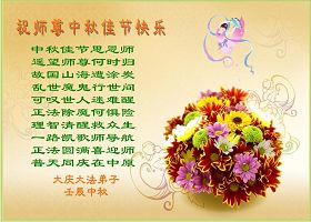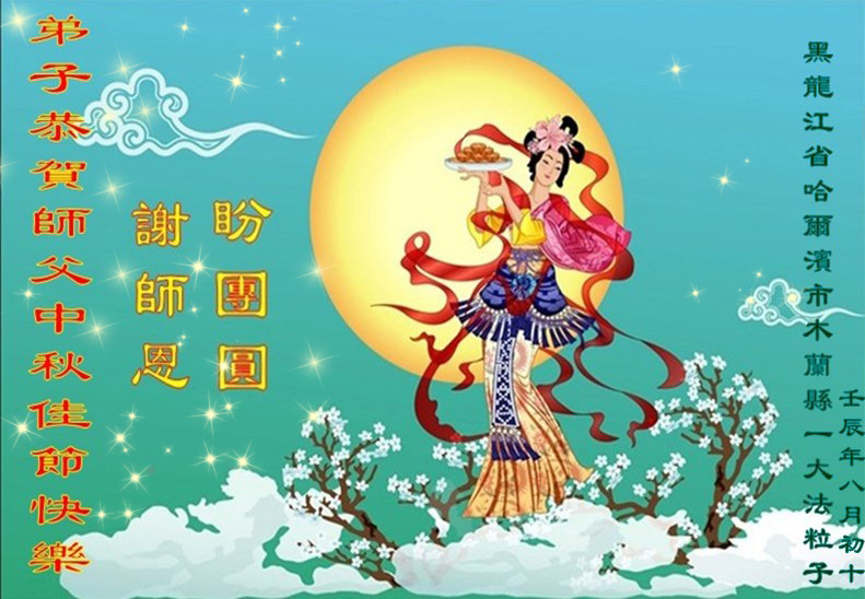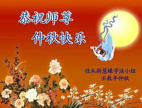 师父您好!在中秋佳节之际弟子非常想念师父,望师父早日回到中国大陆。谢谢师父的慈悲苦度,把一个满身业力的我,从苦海里把我救了出来,这是我永远不能忘记的。 请师父放心,弟子一定要做好三件事,时时刻刻严格要求自己,让师父多一份欣慰,少一份操劳,圆满随师还。 黑龙江省大庆大法弟子恭贺师尊中秋快乐!