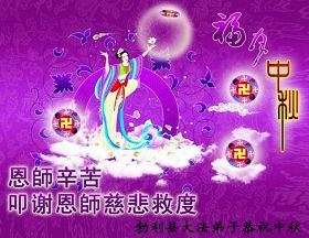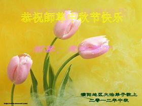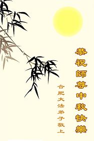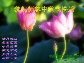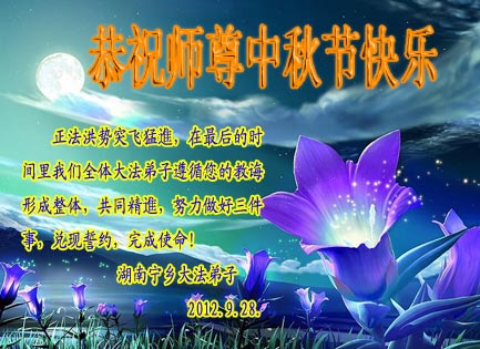 湖北省蕲春县全体大法弟子恭祝恩师中秋佳节快乐!加快步伐向世人讲清真相,认真踏实地做好三件事,跟上正法進程。 2012年9月28日 辽宁省抚顺大法弟子祝师尊节日快乐!