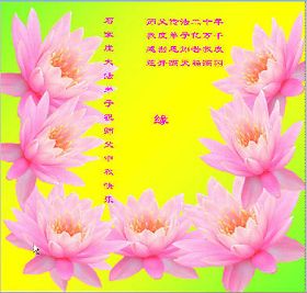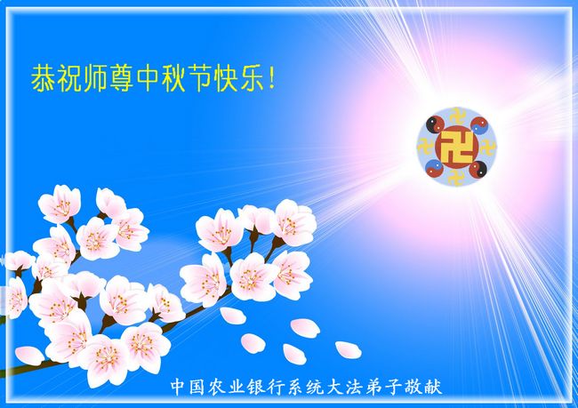 尊敬的师尊您好! 值此中国传统佳节—中秋节之际,在这里向师尊问候!师尊辛苦了! 在返本归真、师尊领我们回家的路上,师父为我们操尽了心,在邪恶迫害的艰难时刻,师父看护着我们;在过关的时刻点悟着我们;在去执着心的时刻,师父耐心的“敲打”着我们。我们走到师父正法的最后了,师父多次鼓励我们,“魔难也好、邪恶的迫害也好,不管怎样你们走过来了,真的走过来了。”(《二十年讲法》)在这里向师父叩头谢恩了。 大法弟子宇明、莲花等一大家修炼的九人及现在还未修炼的家人。 二零一二年九月二十五日 农历八月初十 中国农业银行系统大法弟子恭祝师尊中秋节快乐!