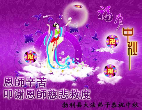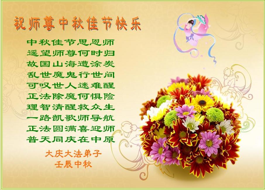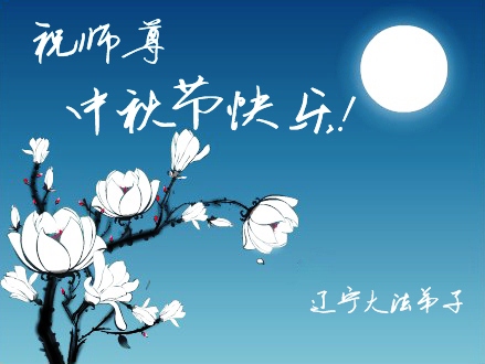 【明慧网二零一二年九月三十日】值此中秋佳节之际,中国大陆和海外的大法弟子纷纷寄来贺卡贺词,恭祝慈悲伟大的师尊中秋快乐,感谢师尊的慈悲救度。以下是部分大陆大法弟子的贺卡和贺词。 辽宁大法弟子祝师尊中秋节快乐!