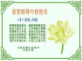 师父中秋佳节快乐!我们全体学法小组,在今后更要做好应该做的三件事,救度更多众生,圆容师父所要的。 濮阳一学法小组全体成员 四川大法弟子中秋感师恩!