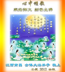 大穹末劫前 主佛发一念 欲除众生害 震惊大穹外 亿万弟子随 齐入三界内 正法遇险阻 弟子助师行 救度世间众 了却洪誓愿 新宇无限美 喜迎众神还 二零一二年九月三十日 大陆阜新弟子敬上! 南京沿江开发区大法弟子恭祝慈悲伟大的师尊中秋快乐!
