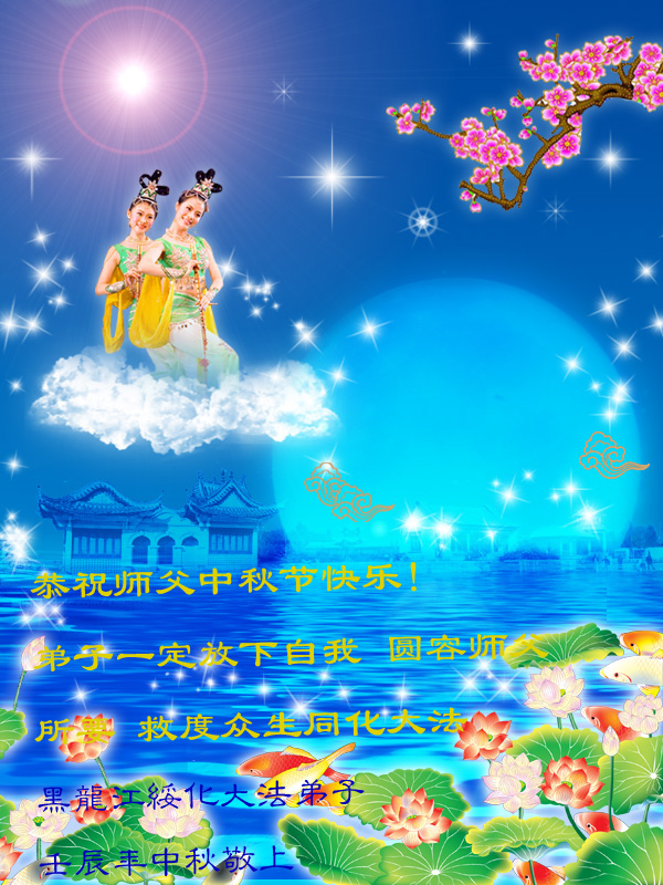 我是天津大法弟子,代表所有得救的众生祝贺伟大慈悲的师尊中秋节快乐! 黑龙江齐齐哈尔大法弟子恭祝师父中秋快乐!