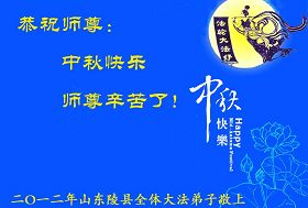 在这中秋佳节之际弟子全家向伟大的师尊致以真诚的节日问候!我们大陆大法弟子决不辜负师父的期望,做好三件事救度更多的世人,早日结束这场邪恶的迫害来迎接师尊的归来,和众弟子们共度普天同庆的那一天。 山东临清全体大法弟子恭祝慈悲伟大的师尊二零一二年中秋节快乐!