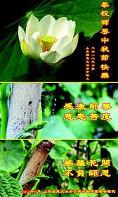 师父好!师父好!师父中秋节好!弟子一定做好三件事,抓紧时间多讲真相救众生,不辜负师尊对我们的慈悲苦度!贵州仁怀全体大法弟子敬上 河北保定大法弟子恭祝师尊中秋快乐!