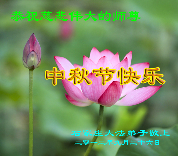 师尊您好: 石家庄大法弟子今后要走好、走正师尊安排的路,多学法、学好法、多救众生,完成兑现历史使命。 石家庄大法弟子 二零一二年九月二十九日 山东威海大法弟子敬祝伟大师尊中秋佳节快乐!