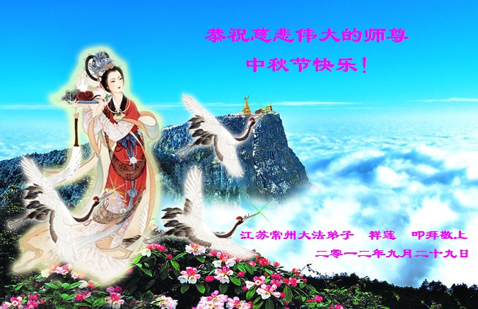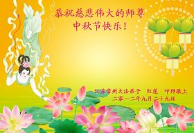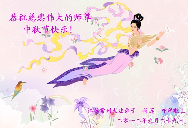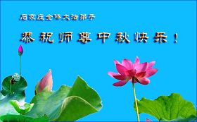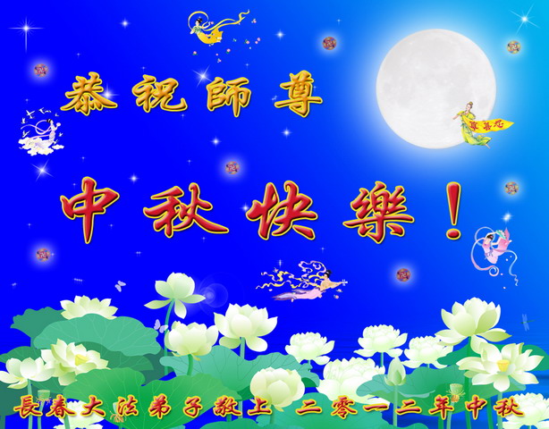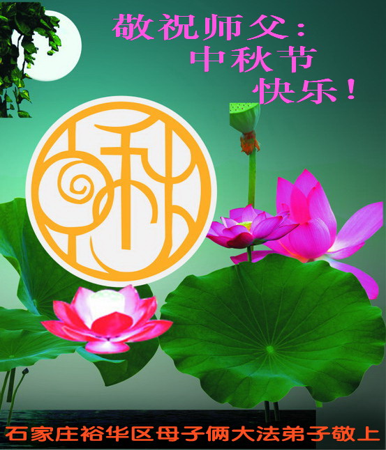 【明慧网二零一二年九月三十日】值此中秋佳节之际,中国大陆和海外的大法弟子纷纷寄来贺卡贺词,恭祝慈悲伟大的师尊中秋快乐,感谢师尊的慈悲救度。以下是部分大陆大法弟子的贺卡和贺词。 石家庄全体大法弟子恭祝师尊中秋快乐!