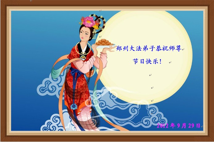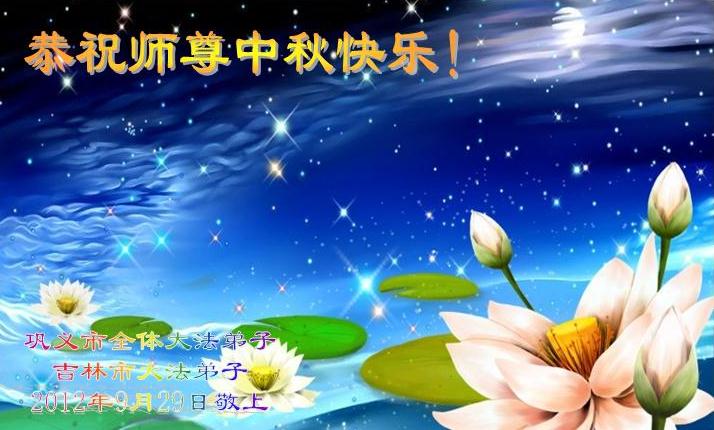 慈悲伟大的师尊:您好!弟子恭祝师尊中秋节快乐!弟子一定好好修炼,跟随师父圆满回家。 四川成都一独修大法弟子敬祝 2012年9月26日 淄博市全体大法弟子恭祝师尊中秋节快乐!