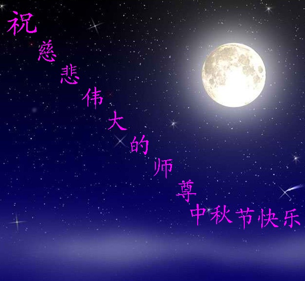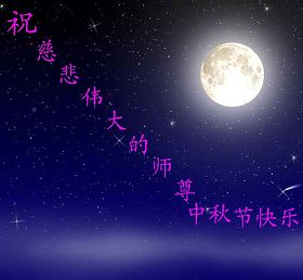 尽管知道师父时刻在我身边呵护着我,但我还是时刻思念着师父!值此中秋佳节,弟子恭祝慈悲伟大的师尊中秋佳节快乐!总有一天,弟子们恭迎师尊回大陆团圆! 二零一二年九月二十九日 恭祝慈悲伟大的师尊中秋快乐!