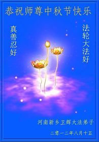 河南新乡卫辉的大法弟子恭祝师父中秋节快乐!您替弟子承受那么多业力,弟子用什么也报不完您的恩情。在以后的日子里,严格要求自己,做好三件事情,精進圆满,跟师父回家。 山东邹城大法弟子恭祝师尊中秋快乐!