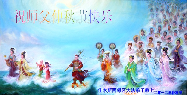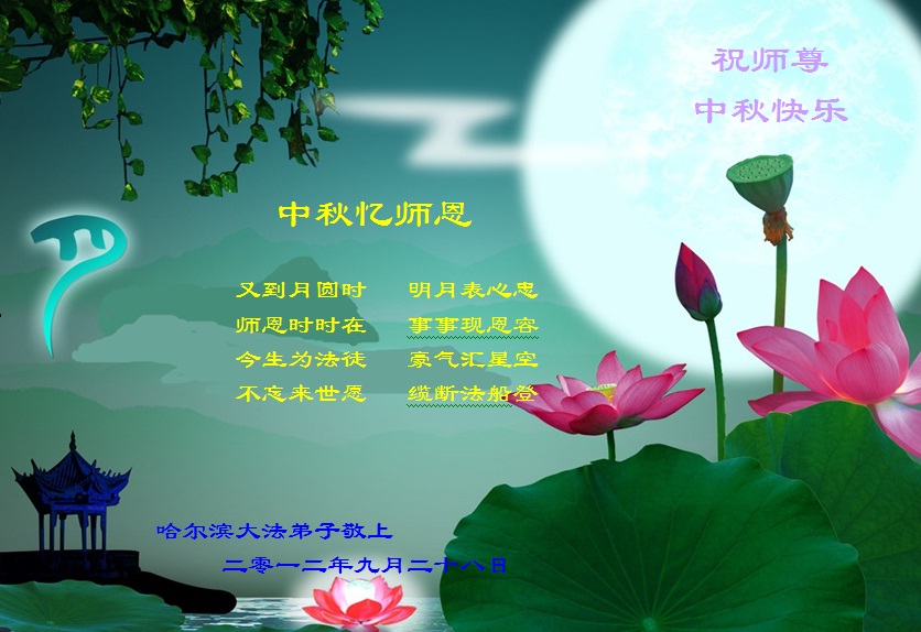 中秋谢师恩 中秋佳节思师尊 师尊救我恩德深 修炼路上慈悲护 弟子巨难师承受 感谢师尊苦救度 弟子一定走正路 它日随师回新宇 普天同庆又同祝 2012年9月29日星期六 回归 世间轮回两亿载 皇王将相轮回演 今生幸得师尊救 把我领上神之路 弟子神路猛精進 内修内找法学好 放下执著轻舟快 回归新宇与穹在 天津大法弟子同化 2012年9月29日星期六 大陆大法弟子祝师尊中秋快乐!