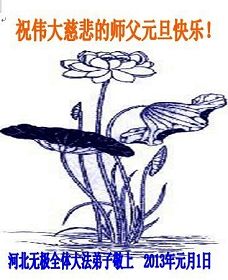 河北秦皇岛青龙大法弟子祝伟大的师尊新年快乐! 弟子想念您,弟子在新的一年里会更加精進,修好自己更多救人,完成使命,让师父放心。 苏州大法弟子恭祝师尊2013年元旦快乐!谢谢师尊对世人的救度!