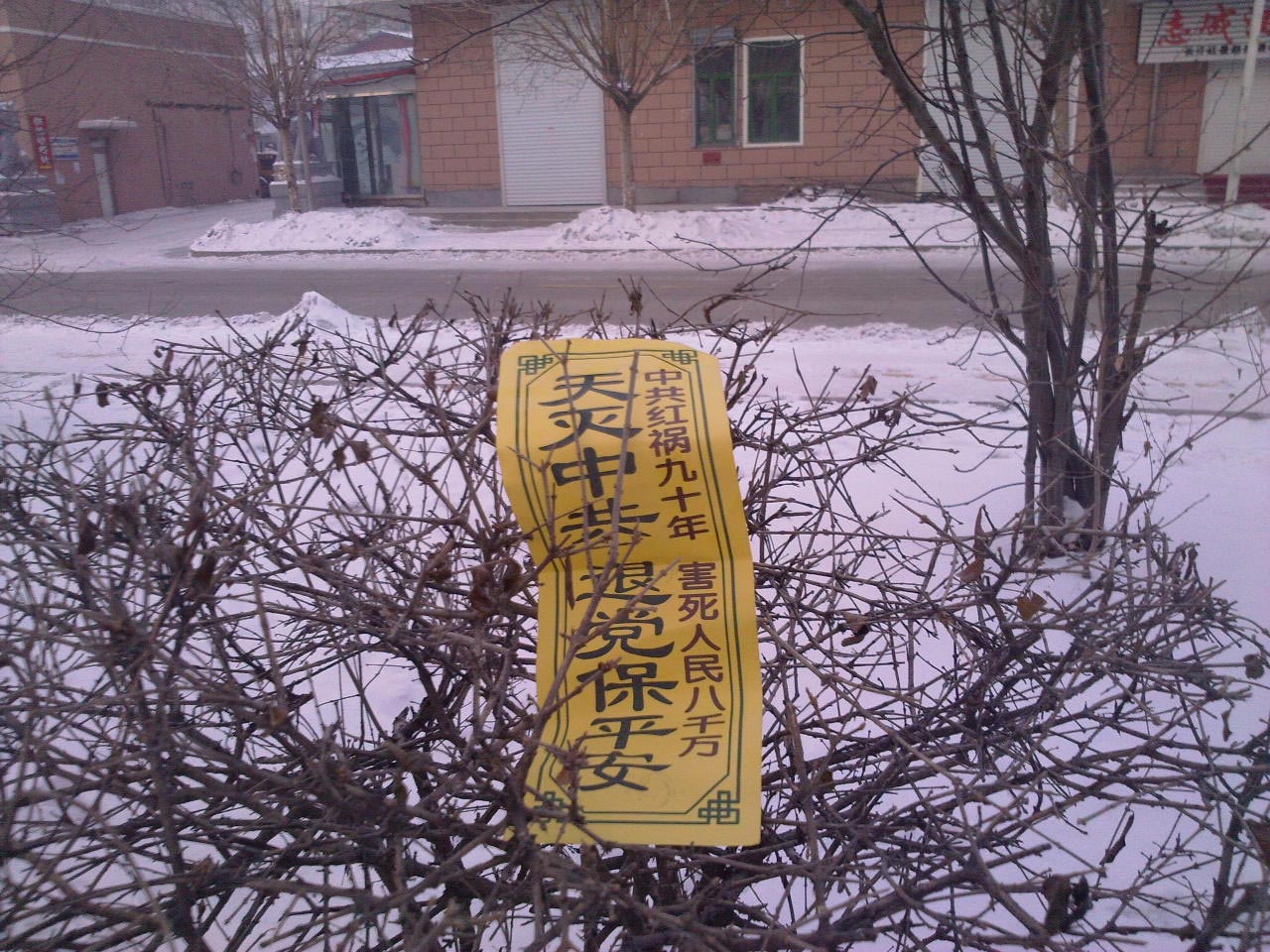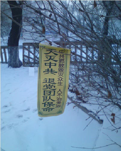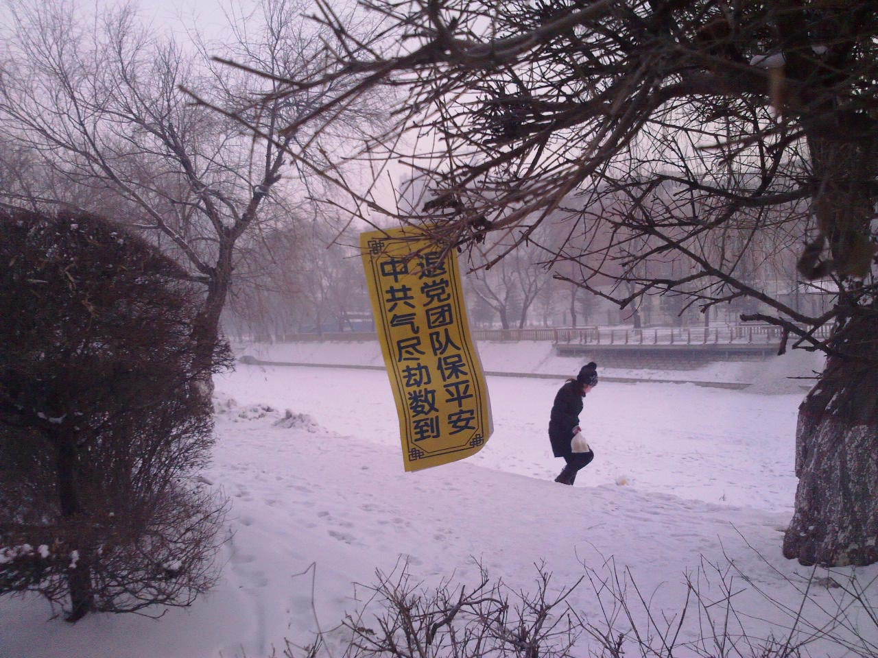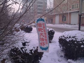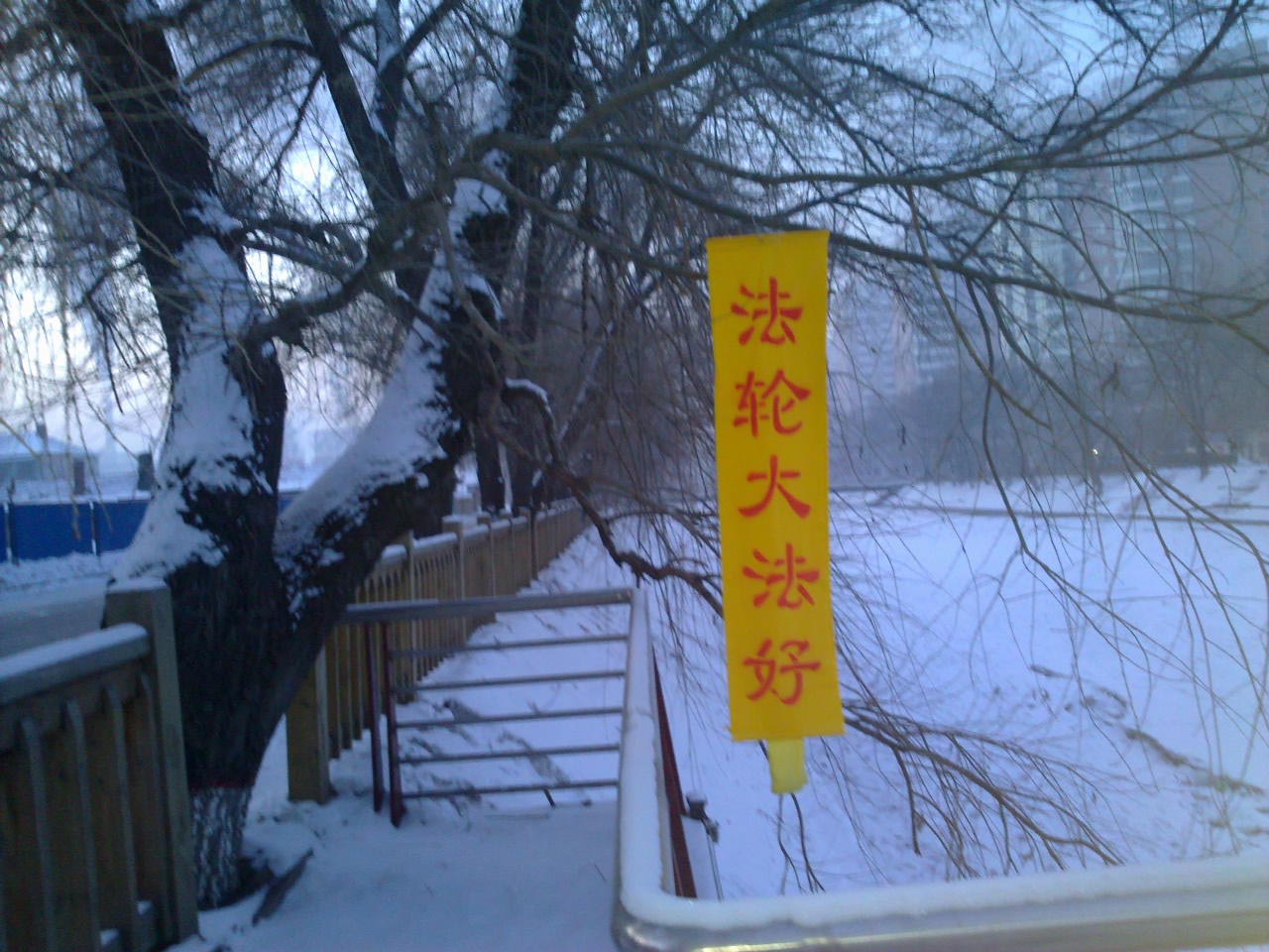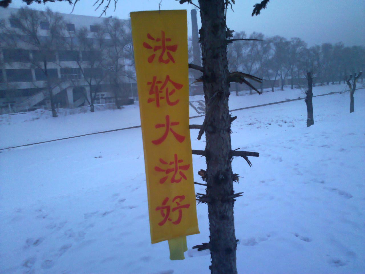 【明慧网二零一三年一月五日】二零一三年一月一日清晨,在黑龙江省某市内路边多处出现“法轮大法好”的条幅,在茫茫白雪的映衬下,黄底红字的条幅显得格外醒目。