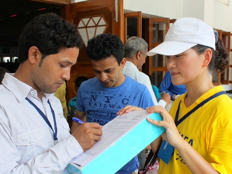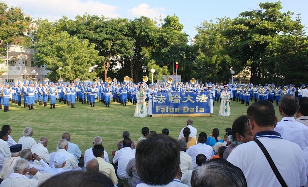 由台湾、日本、印尼、马来西亚、新加坡、澳大利亚等一百四十多位法轮功学员组成的亚太天国乐团这次大会中除了定点演出外,闭幕当天也在园区内作游行表演。印度学员表示,印度没有游行演出的习俗,这次天国乐团的表演让印度人们大开眼界。 闭幕式当天一早,秘书长特地向天国乐团团员们致谢,并用英语说“法轮大法好”他还说:“任何一个人都不应使用暴力迫害善良和平的好人,邪恶不久终会走向尽头。” 在团员们搭车离开园区时,许多与会的工作人员依依不舍地送别,不断挥手,有两位先生大声用英语不断喊“FALUN DAFA IS GOOD”(法轮大法好)感动了现场的所有人。主办单位也特地前往机场送行,并致赠小点心给所有法轮功学员表达感谢。
