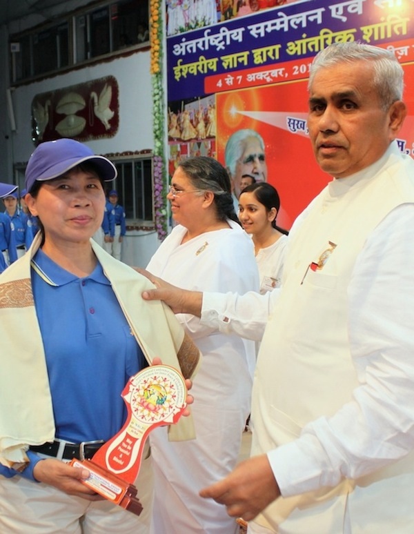 【明慧网二零一三年十月十四日】由台湾、日本等亚太各国一百四十多位法轮功学员组成的天国乐团,受邀在二零一三年十月四日至七日,为印度西部的艾哈迈达巴德(Ahmedabad)举办的世界精神组织的嘉年华会开幕演出,以及展示法轮功五套功法,主办单位也为每一位团员颁发象征最高荣誉的纪念奖牌并献上哈达致谢。 天国乐团会场内开幕演奏,该组织的电视台也做现场直播 |
