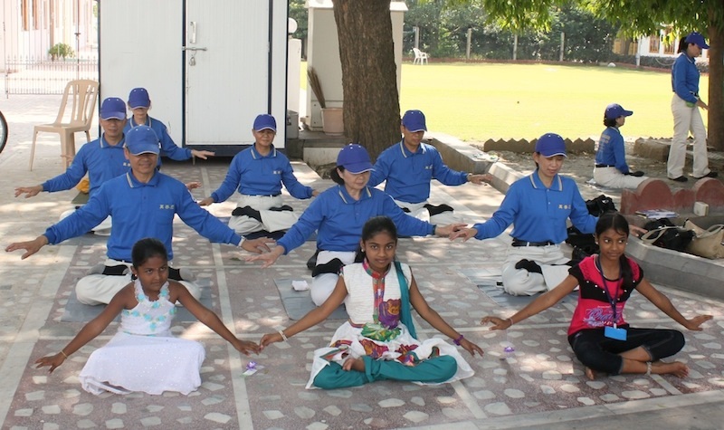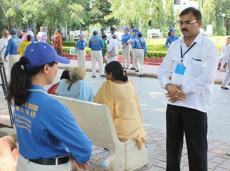 本次活动由一位印度博士,也是该组织的秘书长主动邀请,缘起于二零一二年十二月天国乐团参加海得拉巴市(Hyderabad)“首届精神领袖会议”开幕演出后,他感到非常愉快,并很喜欢天国乐团的表演,因此特地请印度法轮功学员邀约天国乐团参与该组织的年度盛会(International Conference Cum Cultural Festival)。 艾哈迈达巴德(Ahmedabad),是位于孟买北部的印度第七大城市,有着著名景点阿布山(Mt.Abu)。二零一三年该世界精神组织的大会在位于阿布山下专属大型庄园区内举行,现场聚集了数千位来自印度与世界各地的博士、医生与公司总裁、以及该组织所属的两所大学教授、中小学校教师等。在天国乐团演奏的“法轮大法好”、“佛恩圣乐”乐声中开幕,印度法轮功学员了介绍天国乐团是由一群修炼法轮大法的学员组成后,天国乐团并接连演奏“送宝”、“法轮圣王”等多首乐曲,二十多分钟悠扬的乐音洋溢整个表演厅,会场主席致词时说:“谢谢天国乐团,这些来自天国的使者们,带给了我们神圣的讯息。” 印度法轮功学员也在会中向贵宾介绍法轮大法(又称法轮功)是佛家上乘修炼大法,以宇宙最高特性“真善忍”为根本指导,有五套简单易学的功法。并讲述在中国大陆法轮功学员无辜遭受中共迫害,并被活摘器官的真相等。有许多与会贵宾表示,这种践踏人权的事情竟然还在当今世界发生,简直不可思议,也纷纷在会后为“反对活摘器官”连署签名表达正义支持。 在第二天的大会中,天国乐团团员们也上台向贵宾们展示法轮功五套功法,祥和的炼功音乐充满了整个会议厅。会场外一位年长的博士也急切地询问当地学员,印度哪里可以找到《转法轮》等相关著作。也有许多贵宾在户外看着天国乐团团员学炼法轮功的五套功法。  参加大会的人们都很有兴趣学炼法轮功 |