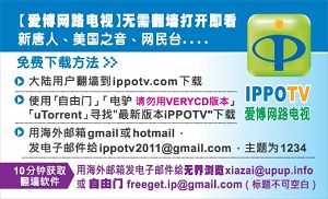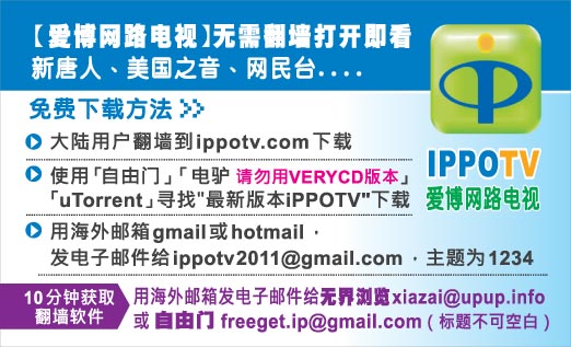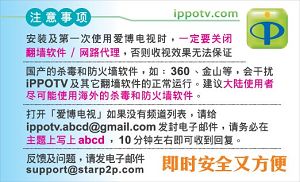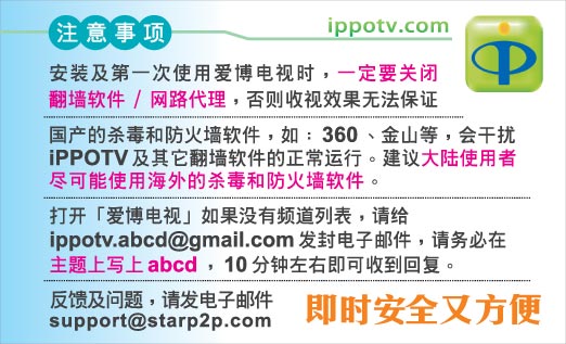 | 【明慧网二零一三年十月二十二日】StarP2P公司2013年10月19日发布新版爱博破网版iPPOTV Ver.12(0939)。中国大陆网民在个人PC电脑上安装爱博电视软件后,不需翻墙,就可以利用宽带上网,及时收看收听到海外的新!唐!人:电视台、《·九·评*共产党》、希望.之声等电视和广播节目,了解真实资讯。 新版爱博破网版(0939)主要是针对目前的封锁特点做了一些突破。特别是其中的“低带宽视频直播”及“音频直播”栏目中的频道带宽较低,在中国大陆能流畅收看。其他视频频道由于受到网络封锁的干扰,在中国大陆不同地区和时段收视效果有所不同,但在海外都可流畅观看。在海外及中国大陆,使用爱博破网版的用户越多,大陆用户突破封锁的效果越好。 爱博电视软件安装简单,有中文界面,可以大力推广给中国大陆的网友了解真相,对于暂时无法安装卫星接收天线的地区尤其有帮助。 大陆用户可通过下面的方法获得“爱博破网版(0939)”软件: (1)通过动态网、无界等翻墙软件登录www.ippotv.com下载 (2)或用海外电子邮箱,如gmail或hotmail给 [email protected]发一封电子邮件,邮件主题为“1234”。即可收到最新版本的爱博电视。 (3)还可通过电驴、BT搜索、下载最新版的iPPOTV下载。电驴请不要用如VERYCD等中国大陆开发的版本。 验证码: MD5:777969705211c183979e8f6a01ba262c SHA1:c25f2ef2560f48533506b9da9700fb2ea73249ee 大陆用户获得软件后,在安装及第一次使用爱博电视前,一定要先关闭翻墙软件或网络代理,否则IPPOTV将无法正确初始化突破封锁的功能,收视效果就无法保证。 另外,一些中国大陆国产的杀毒和防火墙软件会干扰爱博电视及其它翻墙软件的正常运行。因此提醒大陆用户不要用国产的杀毒和防火墙软件,而用海外产的软件。 如果安装、运行后看不到频道列表,又不是上述的两种情况,请用海外邮箱,如gmail,或hotmail给[email protected]发一封电子邮件,主题为abcd,以获得新的节点文件。详细说明请参看如下网页:http://forums.internetfreedom.org/index.php?topic=8572.0 注:使用yahoo或大陆的电子邮箱,邮件会被挡住而收不到。 由于封锁严重,有时会出现点击频道列表没有反应的情况,此时可以试一试播放不同的频道,如果都没有反应,请关闭IPPOTV等十几分钟后再打开。请大家广泛传播IPPOTV,因为用的人越多,越容易突破封锁。