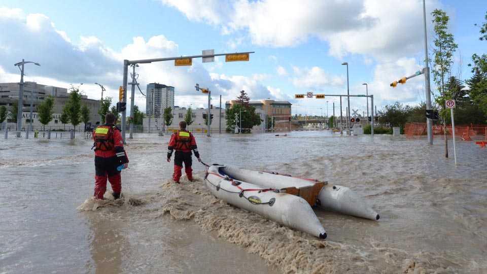 | 【明慧网二零一三年十一月二十日】二零一三年六月中下旬,加拿大阿尔伯塔省南部连日豪雨,河流水位急剧上升。暴雨致使落基山脉山洪暴发,昔日清澈美丽的弓河(Bow River)变成了一条肆虐的黄龙,洪水滔天。 六月二十日凌晨,弓河洪峰抵达卡尔加里,水位较正常高出八至九米。卡尔加里市中心和多个区一夜之间变成了一片泽国,一些道路与桥梁被大水吞噬﹐从睡梦中惊醒的大量居民慌乱逃难,汽车、沙发与冰箱到处漂流,犹如好莱坞灾难片中的场景。 卡尔加里市府二十日宣布進入紧急状态,多达十万居民被通知撤离家园。加拿大总理哈珀二十一日前往卡尔加里视察灾情,加拿大军方与皇家骑警立即参与紧急营救。卡尔加里市民的生命和财产遭受重大损失。  二零一三年六月,加拿大卡尔加里遭遇特大洪水 |