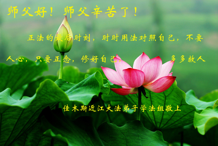 师父好!师父辛苦了!正法的最后时刻,时时用法对照自己,不要人心,只要正念,修好自己,多多救人。 黑龙江省佳木斯梅江一学法组祝师父新年快乐!师父辛苦了!