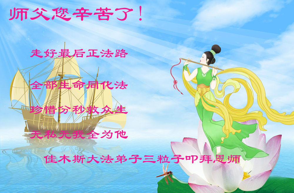 我们全家向慈悲伟大的师尊问好,祝师尊新年快乐! 师尊您辛苦了! 我们曾在天上和师尊签约,下世助师正法、救度众生。历经了生生世世的艰辛,几生的悲欢离合,今世又成为一家人、成为大法弟子、成为连天上的神都羡慕的大法弟子,这要感谢师尊的生生世世的看护与慈悲苦度,我们深深的知道,离师尊的要求相差的还很远,在最后的这段路上,我们一定听师尊的话,勇猛精進,修好自己,完成自己的使命,圆满跟随师尊回真正的家园。 佳木斯一三口之家拜贺 黑龙江佳木斯大法弟子祝师尊新年快乐!