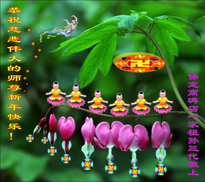 在这新年到来之际,河北保定大法弟子一家在此表达对师父无限的感恩!弟子一家无以回报师恩,只有听师父的话、跟师父走到底的这颗心还能捧给师父。弟子一家敬拜! 河北省保定市高碑店市全体大法弟子恭祝师父新年快乐!