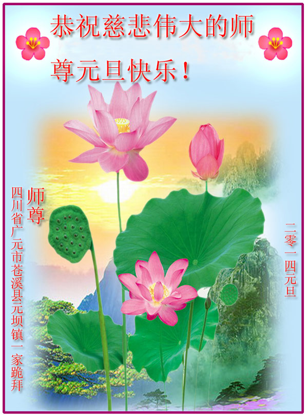 我们向慈悲伟大的师尊致以最诚挚的问候!请师父放心,在新的一年里,我们会按照师父说的做好三件事,修好自己,救度更多的众生,不辜负师尊的慈悲救度!兑现自己史前的誓约, 随师父回家。 四川省南充市阆中市一资料点夫妻大法弟子恭祝慈悲伟大的师父二零一四年元旦快乐!