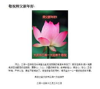 【明慧网二零一三年十二月三十日】 黑龙江省大庆一夫妻大法弟子恭贺师父元旦快乐!