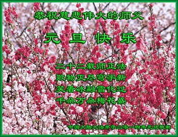 雪花飞舞新年到 数点梅花春意俏 莱州弟子同祝愿 恭祝师父新年好 师恩浩荡法光照 唯有精進以回报 修炼如初比实修 整体协调配合好 师尊教导须记牢 弥补不足向内找 助师正法救世人 圆满回家师父笑 山东省烟台地区莱州市大法弟子 二零一三年十二月十八日 山东烟台莱州大法弟子恭祝慈悲伟大的师尊新年快乐!