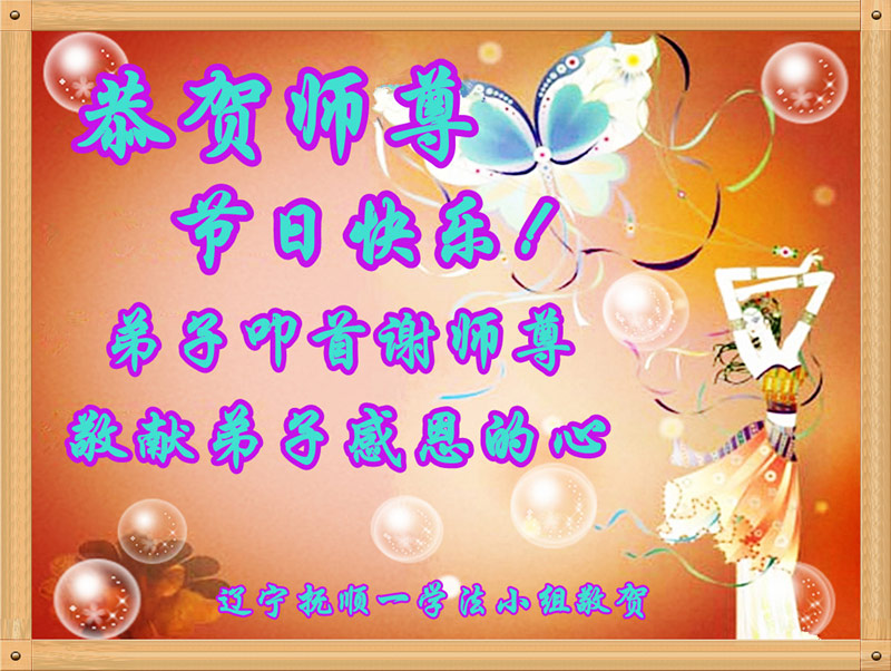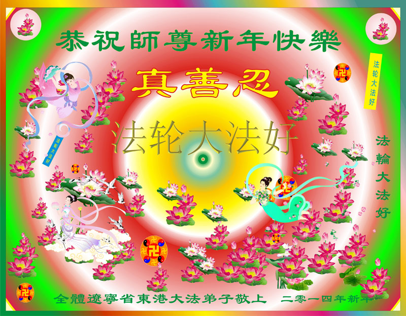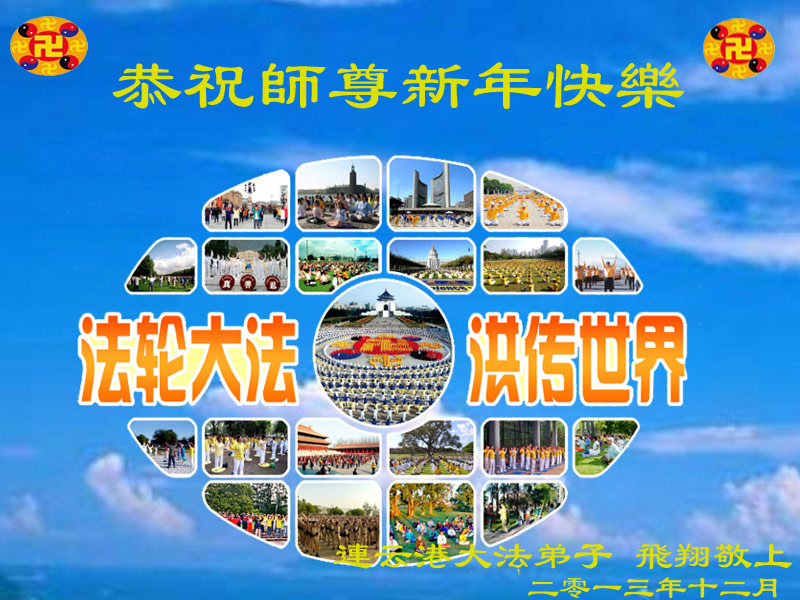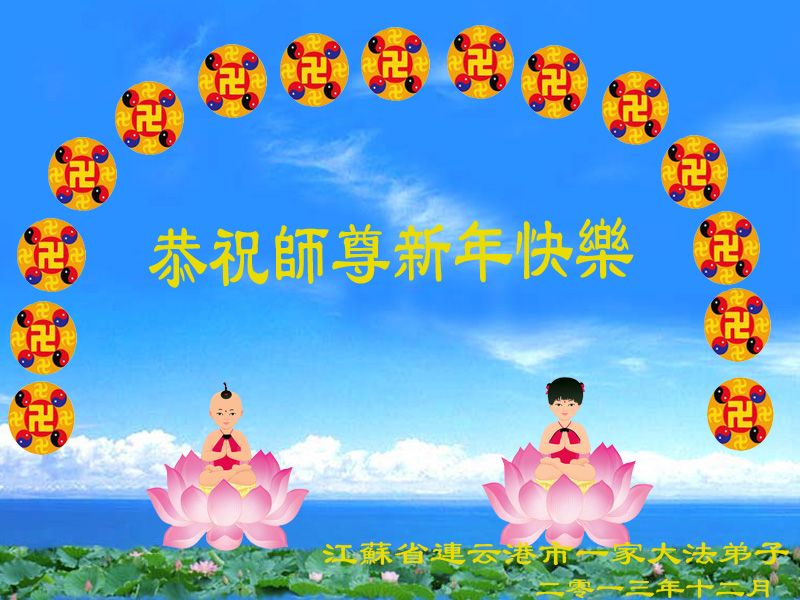 在这辞旧迎新的时刻,用尽人间最美好的语言都表达不尽弟子们对师尊的感恩。此时此刻我们抚顺的大法弟子更加想念远隔万里的师父,我们深感师恩浩荡!无比思念恩师!我们盼望师尊早日归来,与大陆大法弟子团聚。二零一三年的岁月是在师父的呕心沥血中走了过去,师父为宇宙,为众生,为我们大法弟子承受着巨大的苦难。在新的一年里,我们抚顺地区全体大法弟子要更加勇猛精進,多学法,学好法,证实法,做好三件事,救度更多的众生。不辜负师尊的慈悲苦度,让师尊少一些操劳,多一份欣慰。紧跟正法進程,完成我们的史前洪愿!圆满随师还。 辽宁抚顺市一学法小组全体大法弟子恭祝慈悲伟大的师尊新年快乐!