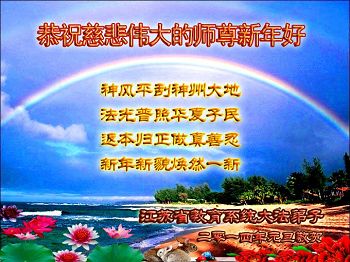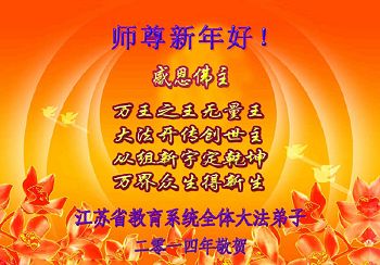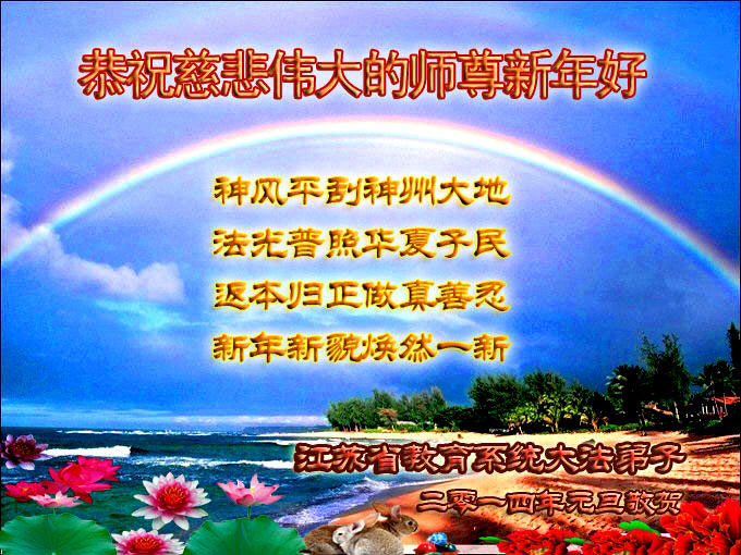 江苏省教育系统大法弟子恭祝慈悲伟大的师尊新年好! 神风平刮神州大地 法光普照华夏子民 返本归真修真善忍 新年新貌焕然一新 江苏省教育系统全体大法弟子恭祝师尊新年好!