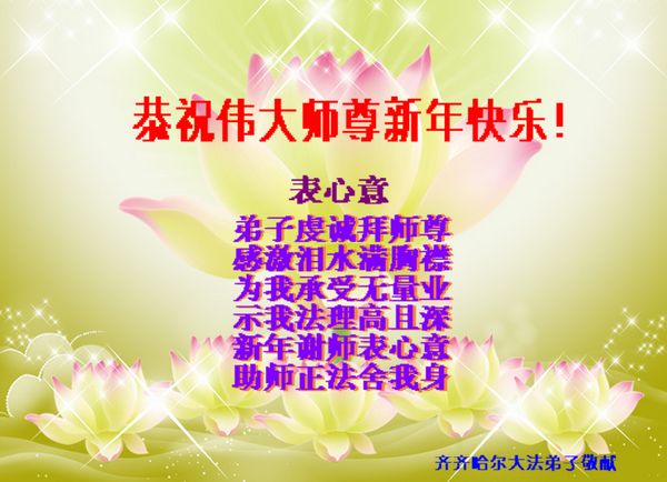 辞旧迎新表心意 弟子虔诚拜师尊 感激泪水满胸襟 为我承受无量业 示我法理高且深 新年谢师表心意 助师正法舍我身 齐齐哈尔市碾子山区大法弟子恭祝慈悲伟大师尊新年快乐!