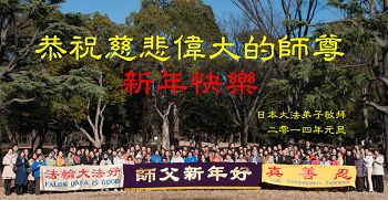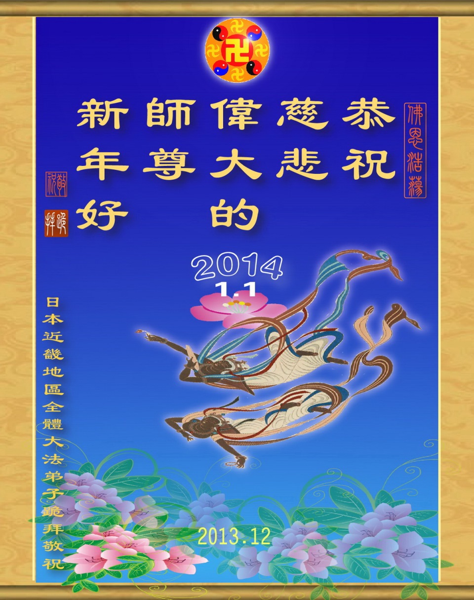 【明慧网二零一三年十二月三十一日】 日本大法弟子恭祝慈悲伟大的师尊新年快乐! 日本关西地区法轮大法弟子祝慈悲伟大的师尊新年快乐!