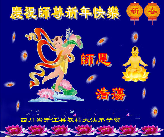 我们河北青龙某某乡镇全体大法弟子恭祝师尊新年快乐!请师尊放心,我们一定要放下自我,形成整体,做好三件事。 广东潮南区乡镇各行业内外整体大法弟子恭祝师尊元旦新年快乐!