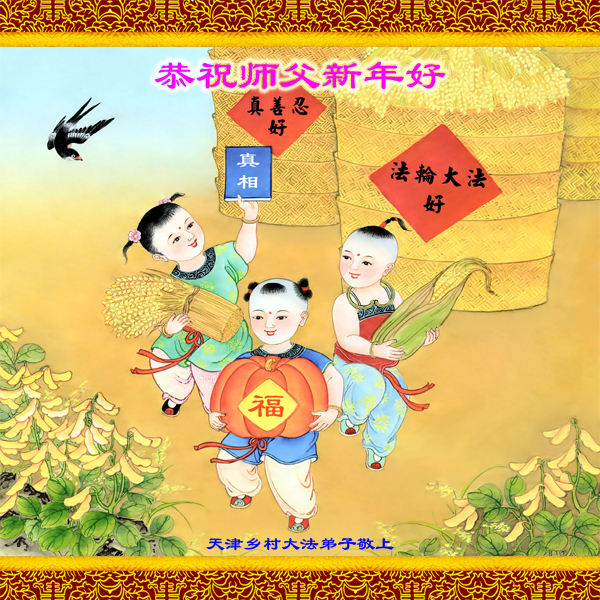 我们是天津地区的乡村大法弟子,在新年来临之际,弟子们恭祝师尊新年好!有机会能够上明慧网,与全世界大法弟子溶为一个整体,感谢师父的慈悲加持与呵护。 在今后的修炼中,弟子们会抓紧实修,做好三件事,愿慈悲伟大的师尊多一些欣慰,少一些操劳。 辽宁本溪县农村大法弟子恭祝师尊新年快乐!