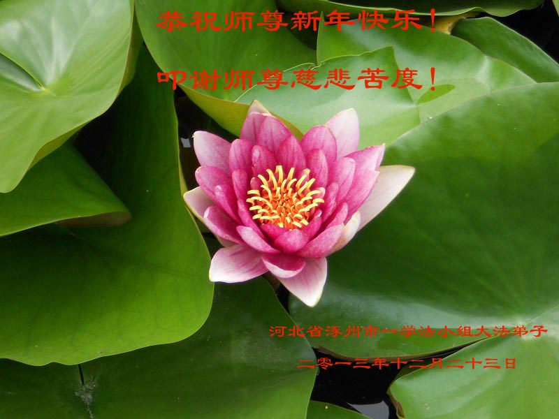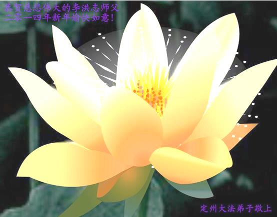 2014年将至,慈悲伟大的师父用巨大的付出和承受给众生换来了新的一年,希望在劫难之前能救下更多的世人,弟子感恩师父慈悲救度和给众生的希望,在新的一年里努力做好三件事。弟子代表家人同修恭祝师尊新年快乐! 河北保定涿州大法弟子 河北省保定市涞水县西片全体大法弟子敬祝伟大的师尊新年快乐!