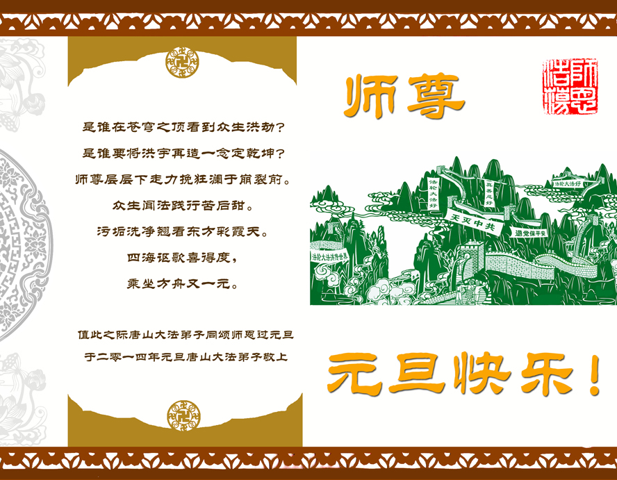 是谁在苍穹之顶看到众生洪劫? 是谁要将洪宇再造一念定乾坤? 师尊层层下走力挽狂澜于崩裂前。 众生闻法践行苦后甜。 污垢洗净翘看东方彩霞天。 四海讴歌喜得度, 乘坐方舟又一元。 值此之际唐山大法弟子同颂师恩过元旦。 于二零一四年元旦唐山大法弟子敬上 河北唐山一学法小组全体弟子在新年来临之际遥拜师尊!恭祝师尊新年快乐!